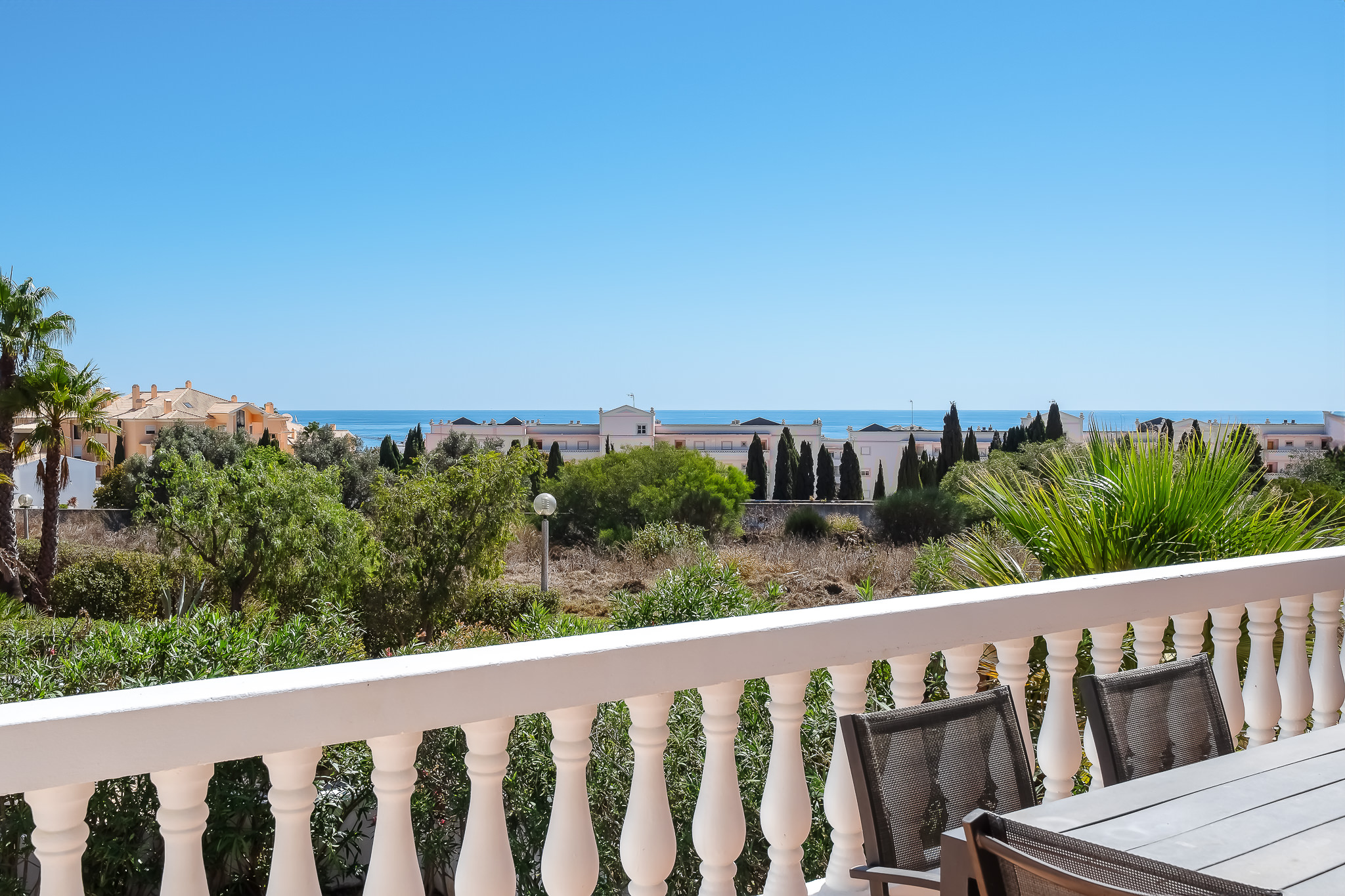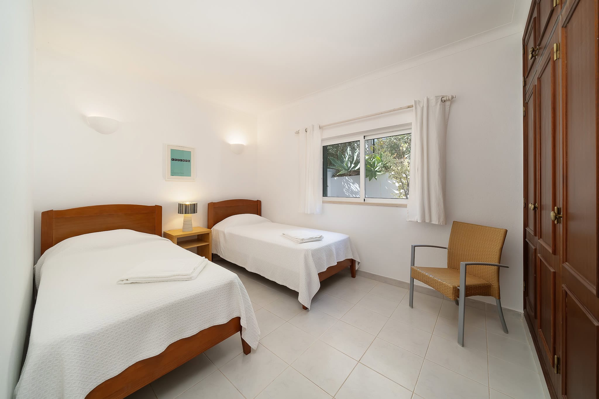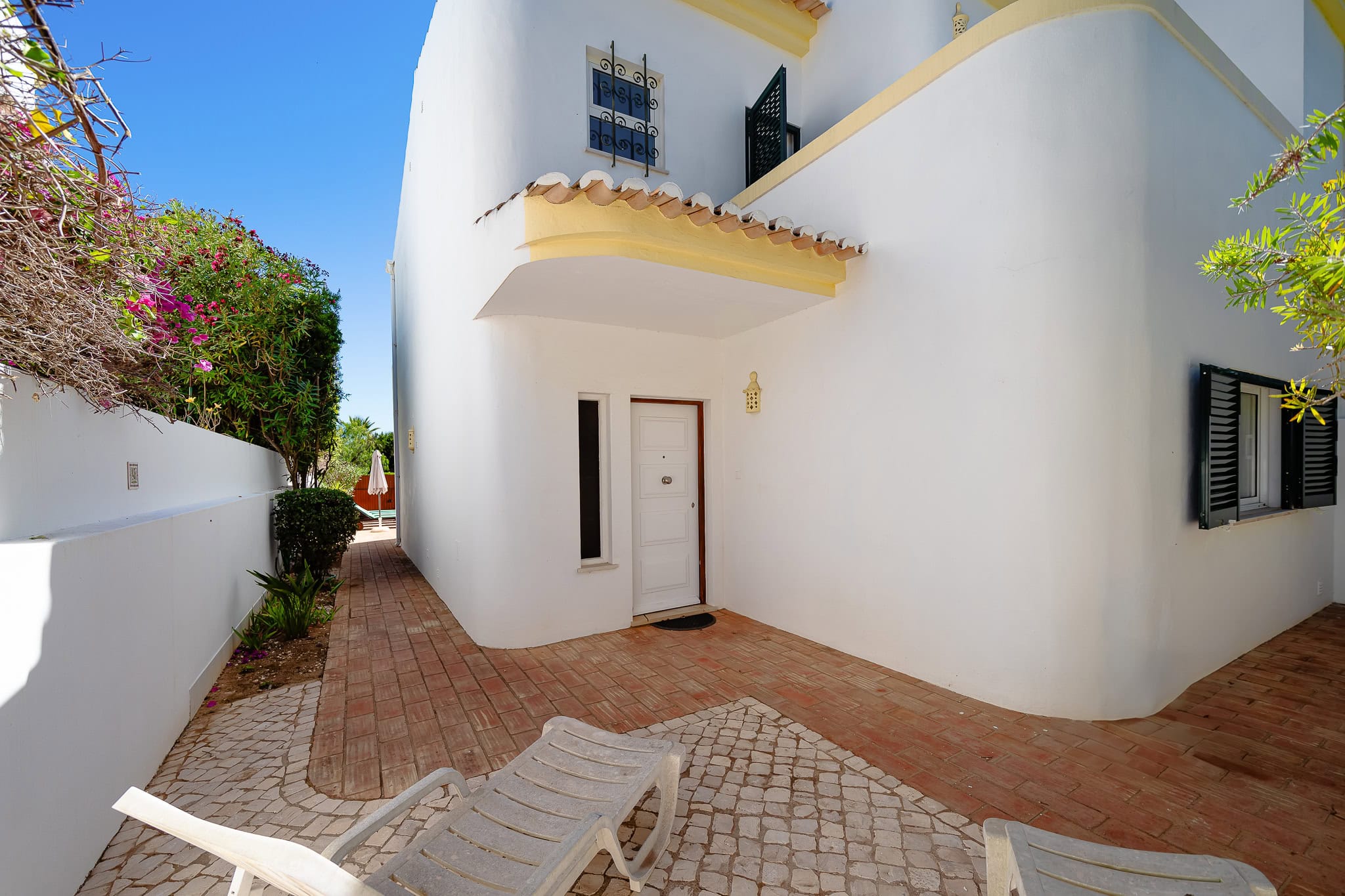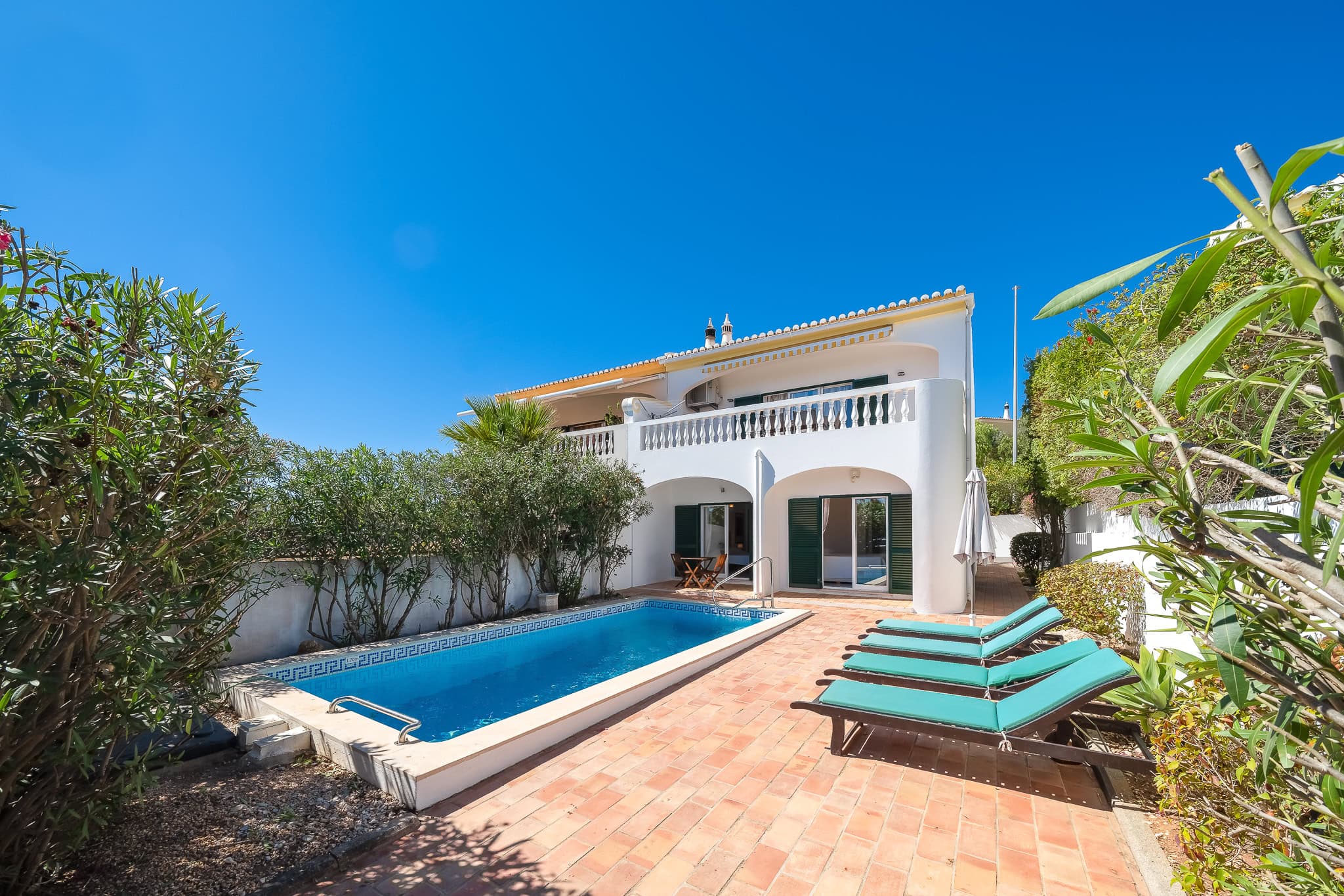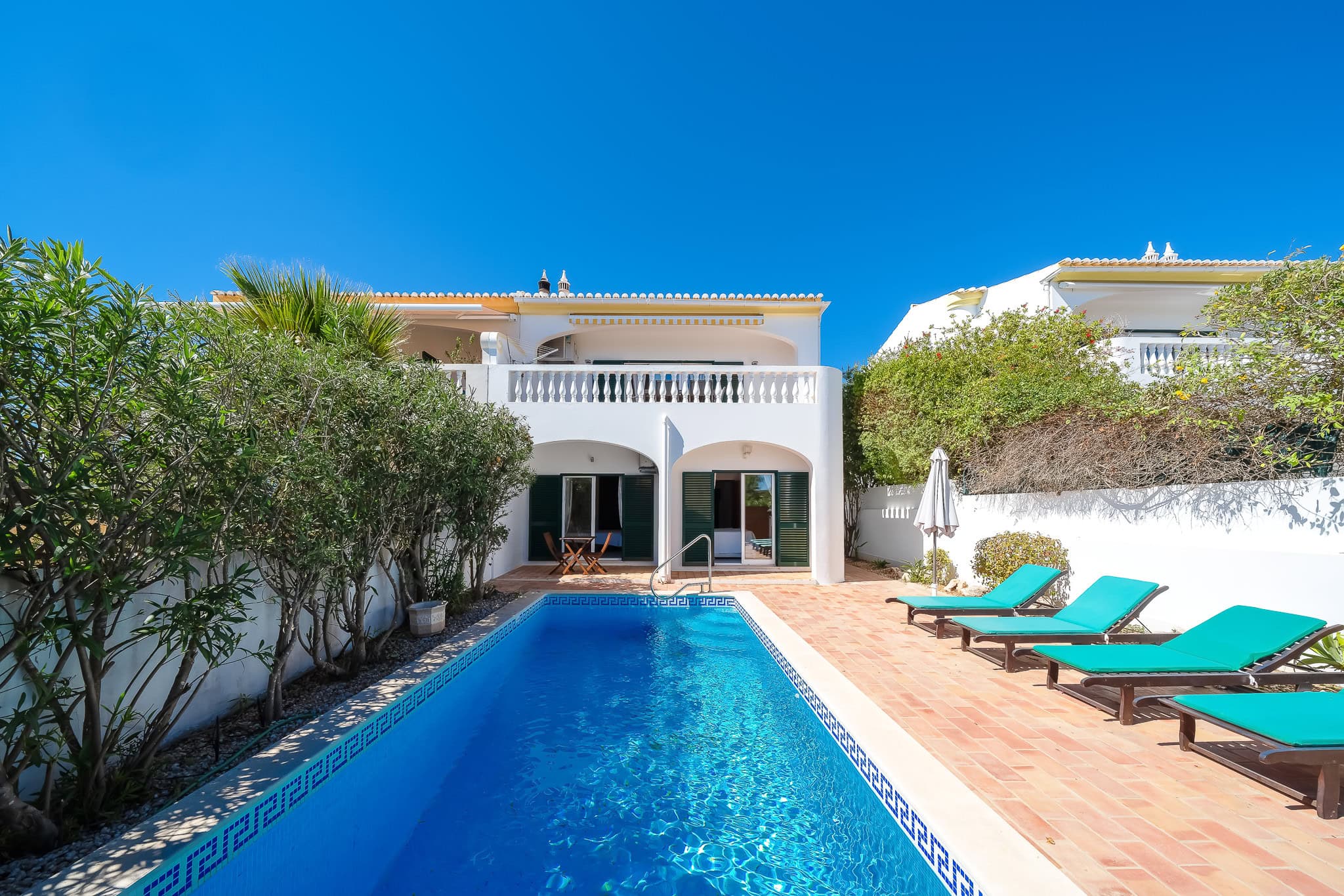 This semi detached villa in Praia da Luz is located in a quiet spot with a wonderful shared garden and a private pool, within easy reach of the beach in Luz and restaurants. This villa is fantastic value and offers a master bedroom with en-suite, a further double bed bedroom and a twin, as well as a family bathroom. South facing bedrooms have their little private terrace overlooking the pool. Upstairs a big lounge and open plan kitchen, both leading to a terrace, with views of the pool, the shared mature garden and of the village of Luz. The kitchen is well equipped, and has a lot of space for family and friends to cook together. The living area has plenty of sitting, a big screen TV with HD Cable TV and a dining area. There is space for dining and BBQ outside on the terrace. There is also High Speed Fiber Internet. The villa is centrally located, close to everything but in a tranquil area. There is private parking for the villa. This villa is about 10 to 15 minutes walk from numerous restaurants, supermarkets, bars, the promenade and the beach in Luz.