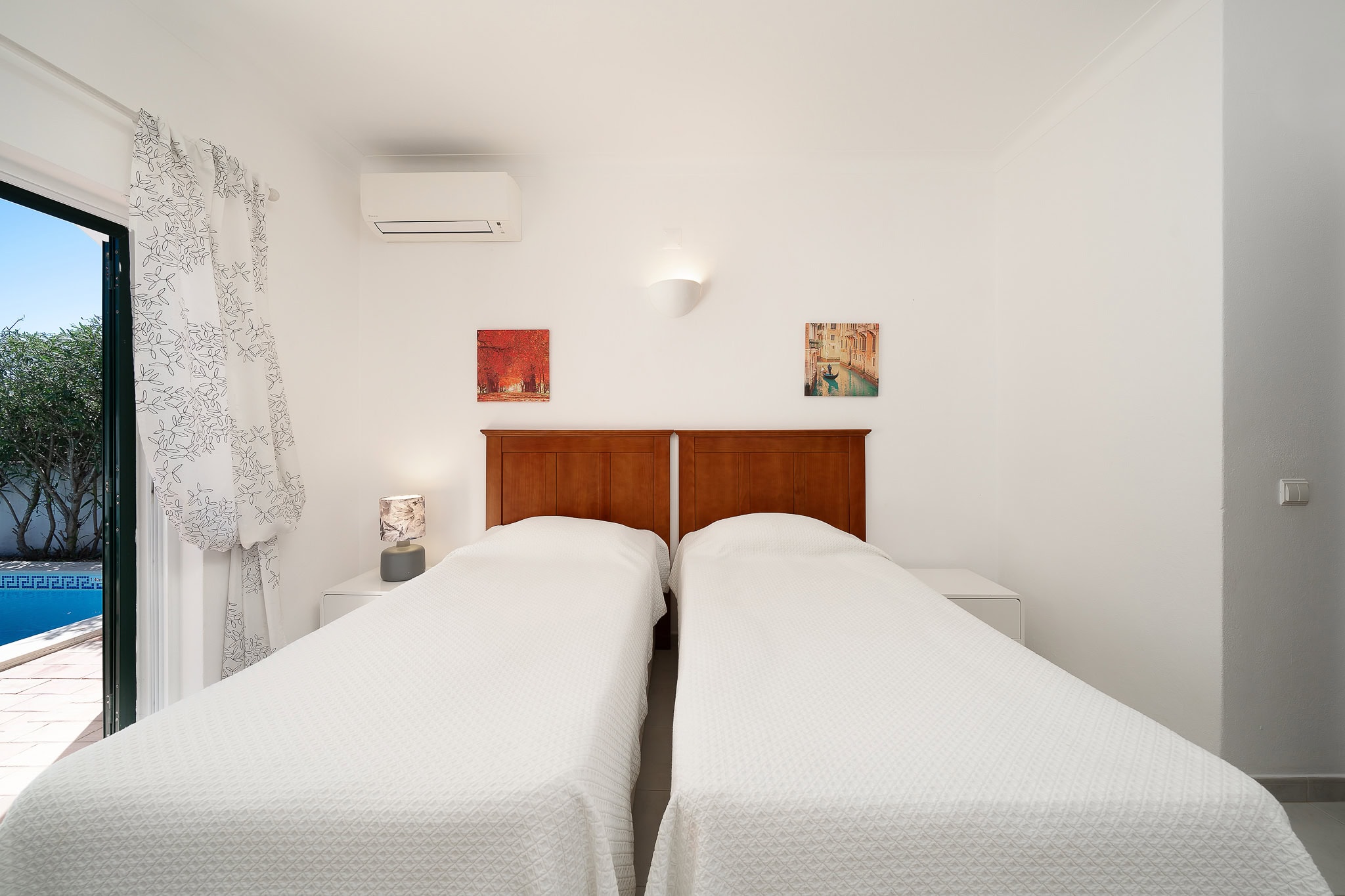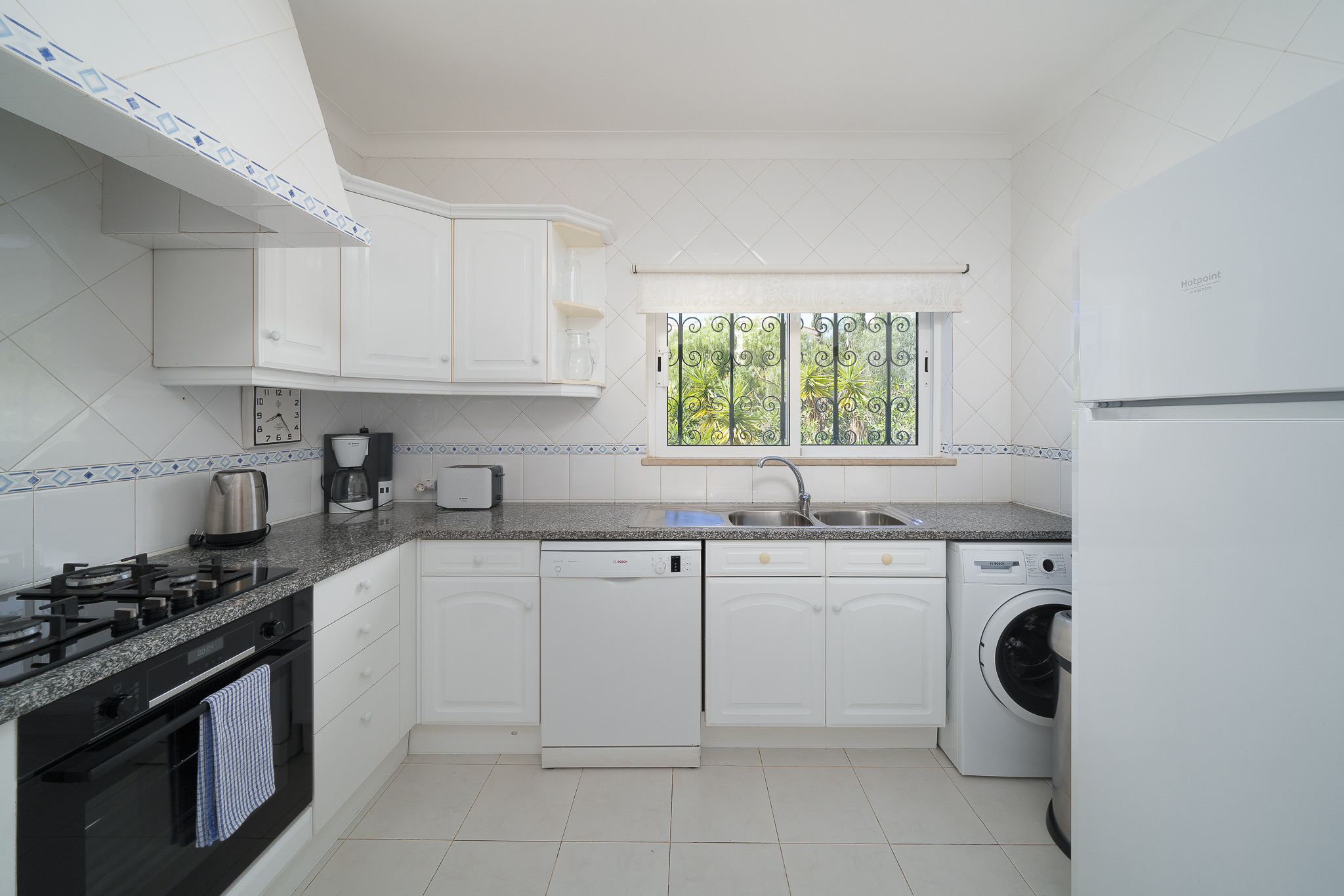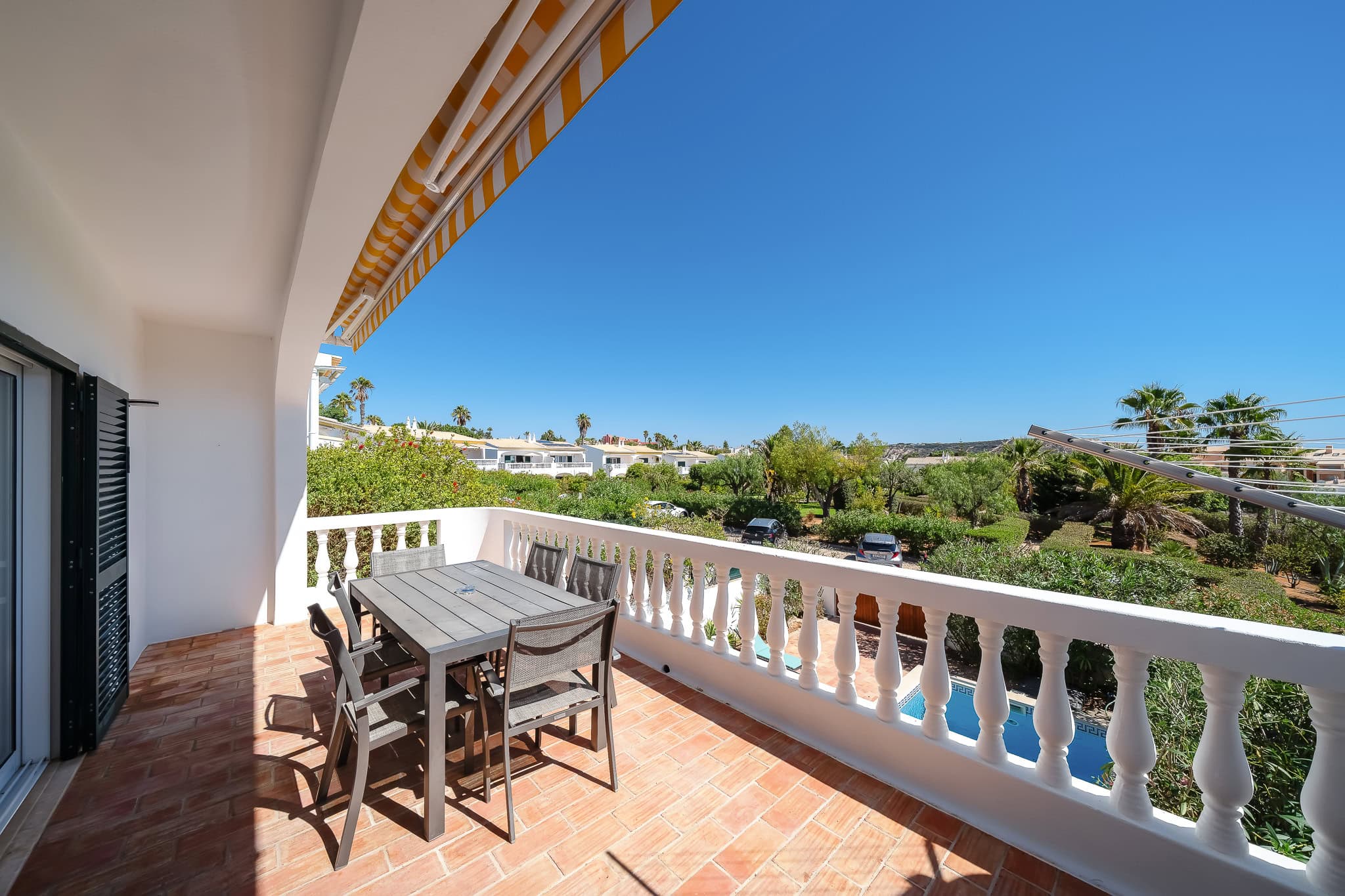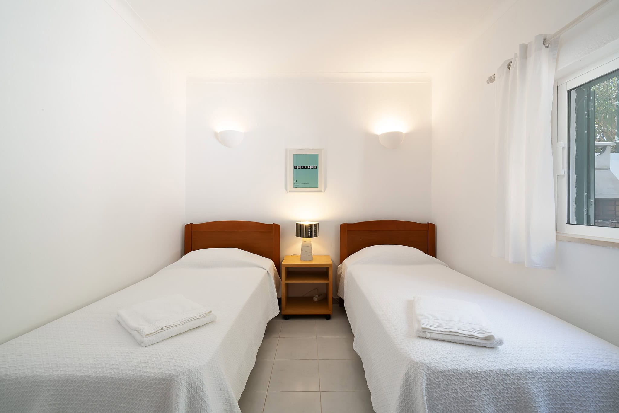This semi detached villa in Praia da Luz is located in a quiet spot with a wonderful shared garden and a private pool, within easy reach of the beach in Luz and restaurants. This villa is fantastic value and offers a master bedroom with en-suite, a further double bed bedroom and a twin, as well as a family bathroom. South facing bedrooms have their little private terrace overlooking the pool. Upstairs a big lounge and open plan kitchen, both leading to a terrace, with views of the pool, the shared mature garden and of the village of Luz. The kitchen is well equipped, and has a lot of space for family and friends to cook together. The living area has plenty of sitting, a big screen TV with HD Cable TV and a dining area. There is space for dining and BBQ outside on the terrace. There is also High Speed Fiber Internet. The villa is centrally located, close to everything but in a tranquil area. There is private parking for the villa. This villa is about 10 to 15 minutes walk from numerous restaurants, supermarkets, bars, the promenade and the beach in Luz.